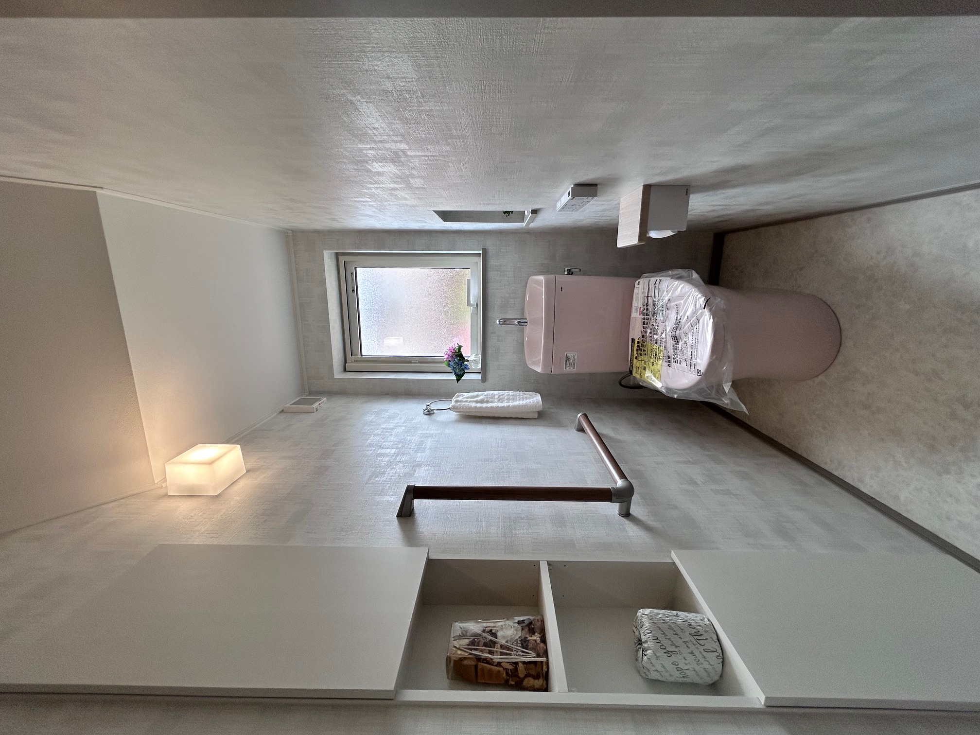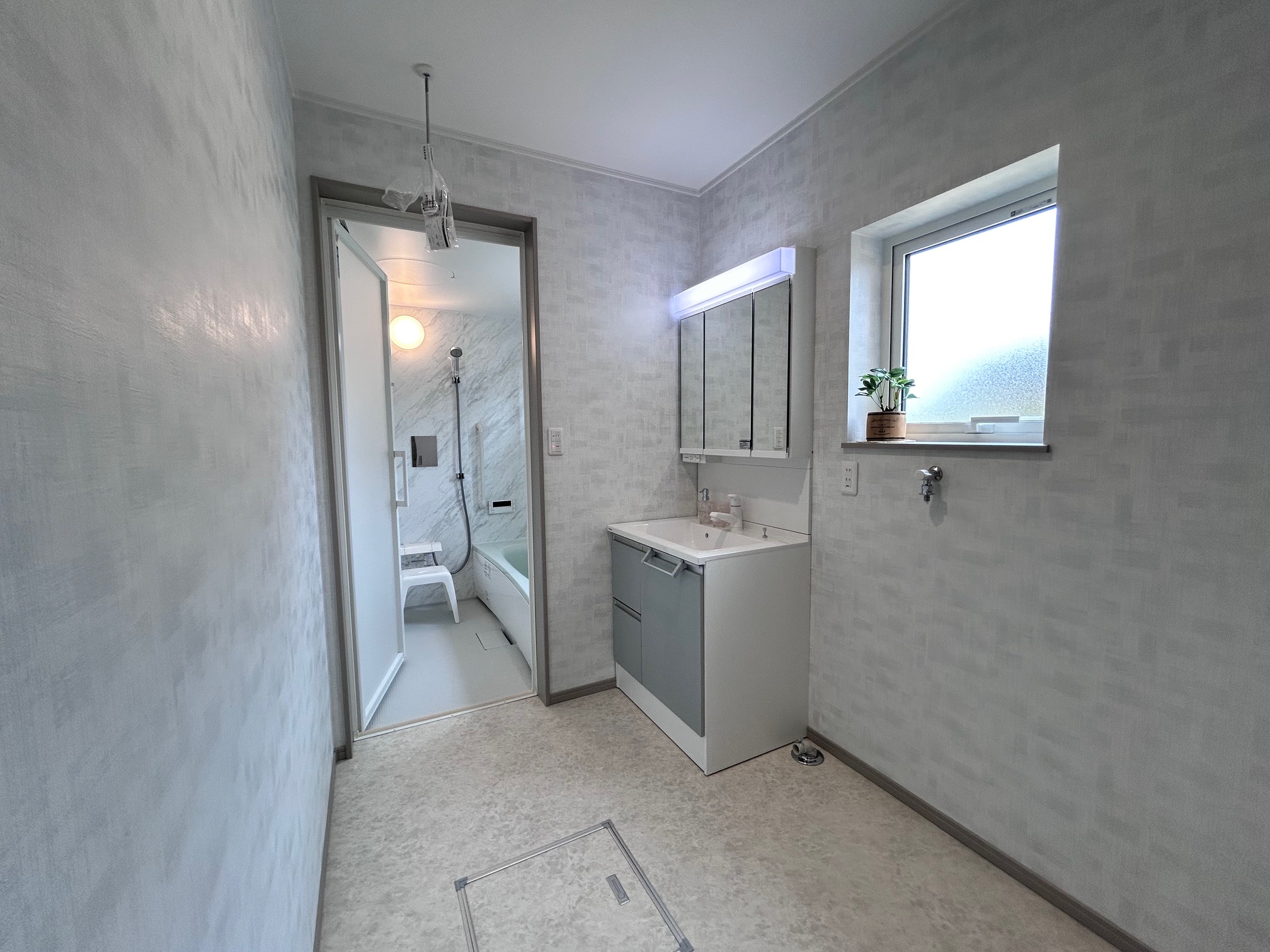 こちらにも壁には各部屋同じグレーのクロスを、床にはグレージュのクッションフロアを施し、LDKと同じルールで空間作りを。浴室の背面も同系色のパネルカラーですね(^ ^)