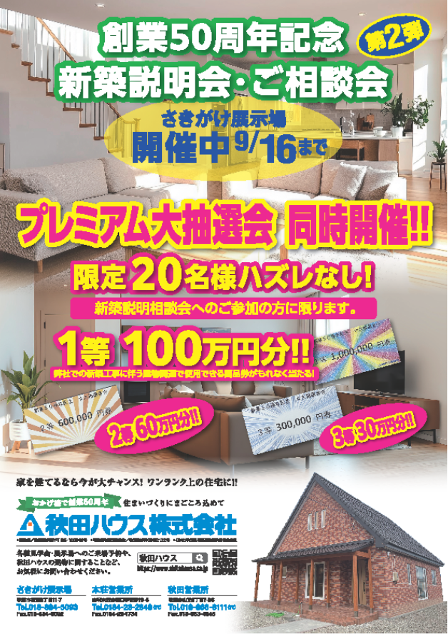 9月15日(月)までの一か月間、さきがけ展示場にて住宅相談会・説明会・抽選会を開催致します。