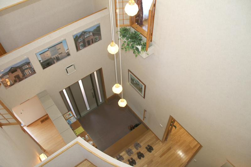玄関に入ると上部には大きな吹き抜けがあり、3階建てのお家になっています。