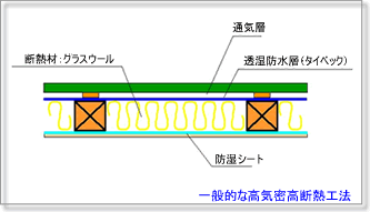 グラスウールやウレタン吹付け、板状プラスチック系断熱材など断熱材に違いはありますが、一般的に高断熱高気密と称する住宅の多くは、この施工を採用しています。