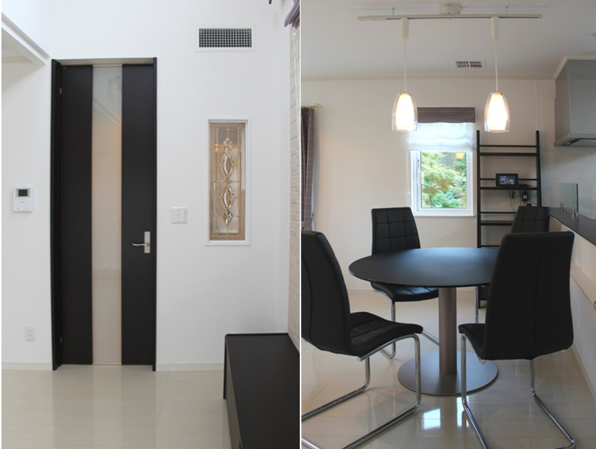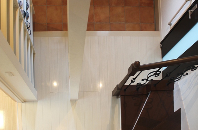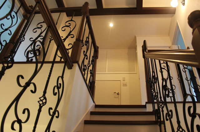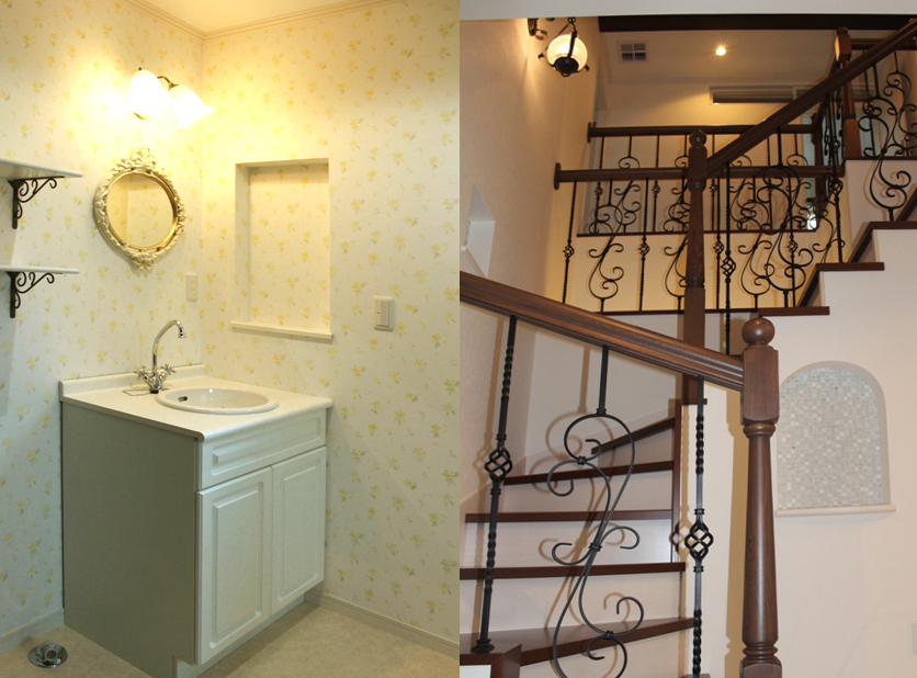 壁紙やタイルのアクセント、アイアンの階段がポイントです。