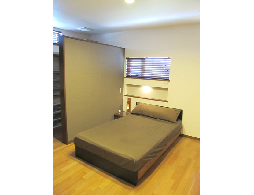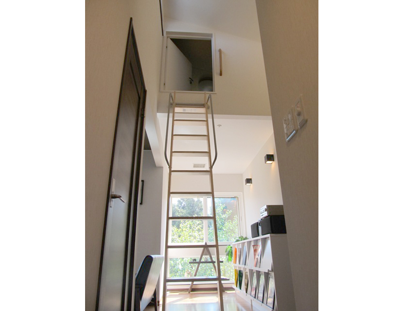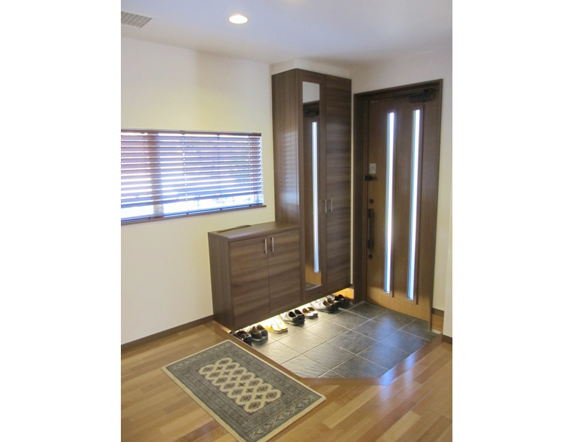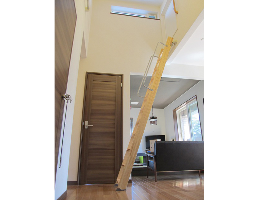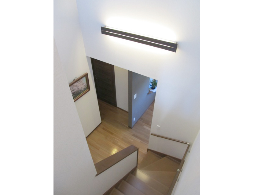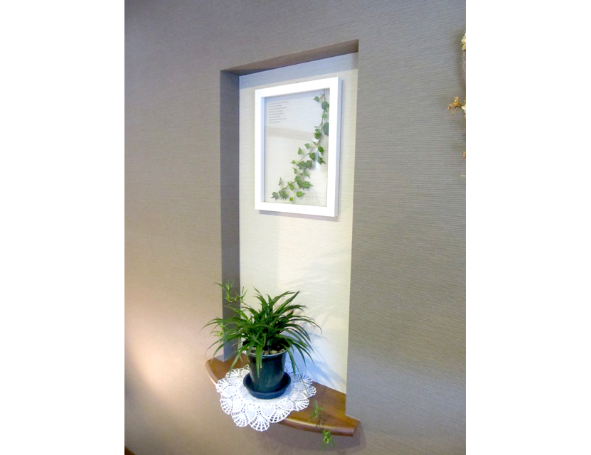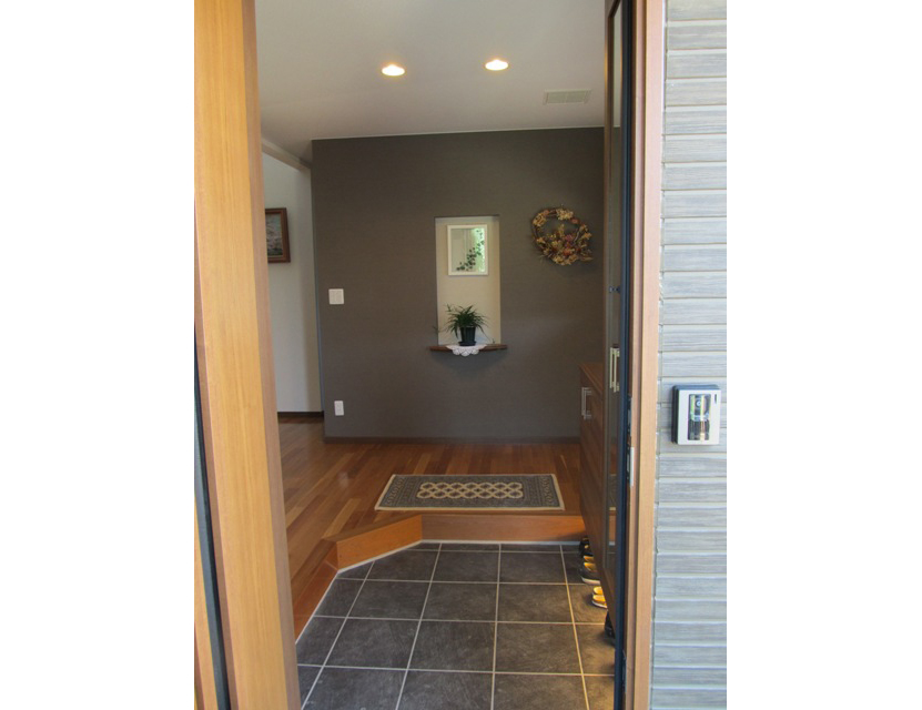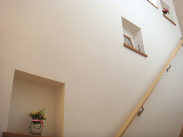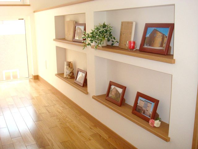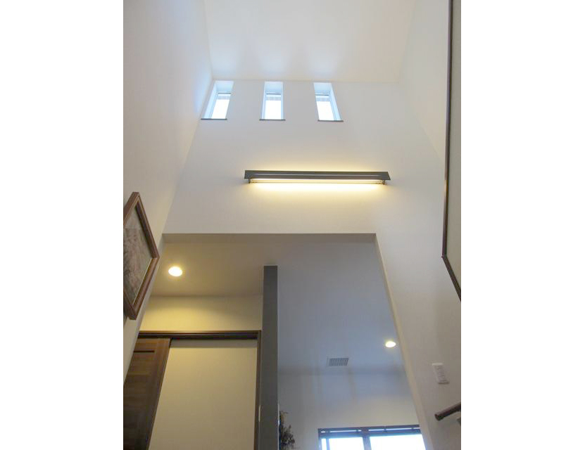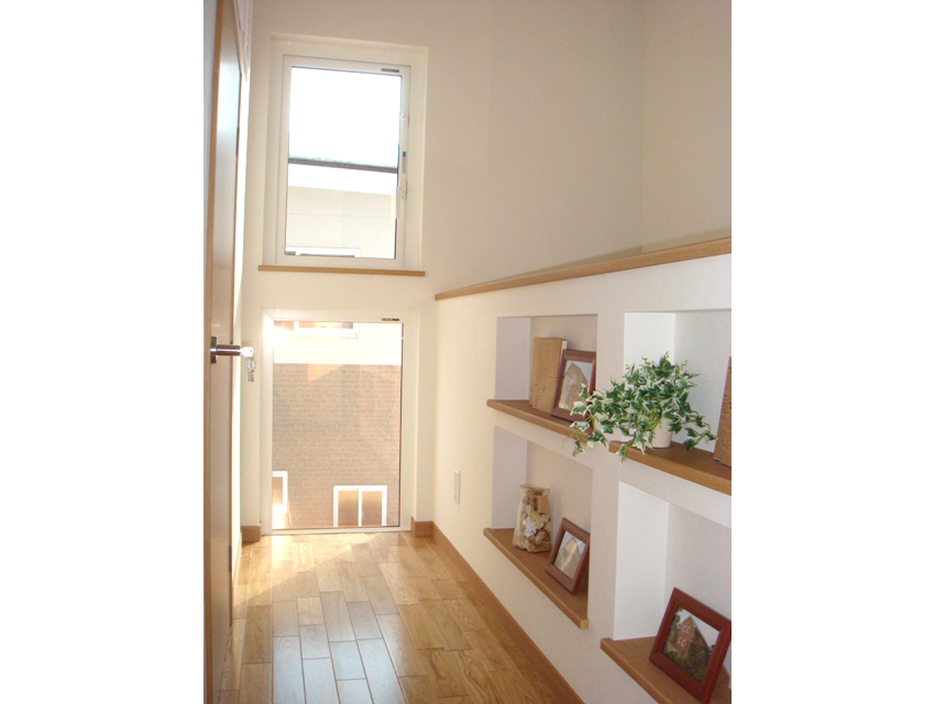 玄関上の吹き抜け、壁厚を利用した掘り込み棚がポイントです。